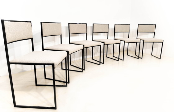 Mid Century Modernes Set von 6 Esszimmerstühlen im Willy Rizzo Stil, Italien, 1970er Jahre. Schwarz lackiert, neu gepolstert mit beigem Boucle-Stoff.