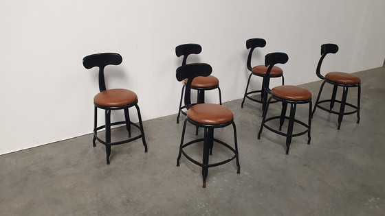 6-teiliges Modell Stuhl oder Hocker, Hocker aus mattschwarzem Metall mit cognacfarbenen Skai-Ledersitzen. Original und markiert.