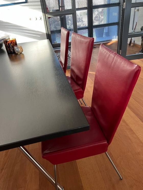 ZustandAusgezeichnetFarbenRotMaterialLederAnzahl der Artikel6MarkeLabelHöhe91 cmBreite47 cmTiefe51 cmSitzhöhe47 cm