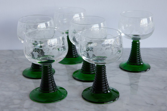 Set aus 6 gravierten Gläsern mit grünem Stiel im Vintage-Stil. Abmessungen pro Glas (25 cl): Durchmesser: 8 cm. Höhe: 13 cm. Alte Gegenstände weisen Spuren der Zeit auf. Perfekter Zustand.