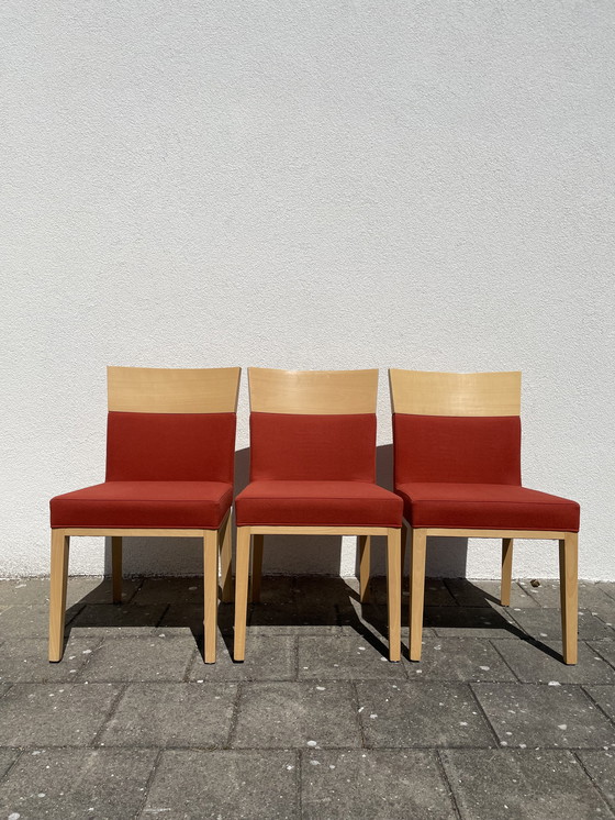 Logica 00930 Designerstühle der Marke Montbel, entworfen von den Brüdern Edi & Paolo Ciani. Schöne und edle Stühle, die normalerweise an den Geschäftsmarkt geliefert und verkauft werden. Daher auch die Bezeichnung Vervoort. Die Stühle bestehen aus einem Gestell aus massiver Buche und einer Sitzfläche und Rückenlehne, die vollständig mit Wollfilz gepolstert sind. Die Sitzfläche und die Rückenlehne sind mit einem Keder versehen.