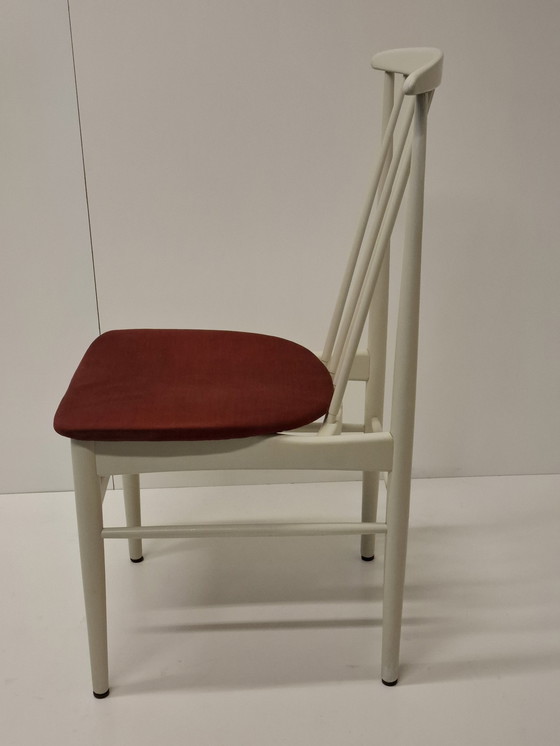 Vervollständigen Sie Ihr Esszimmer mit diesem Set aus sechs skandinavischen Esszimmerstühlen, inspiriert vom ikonischen Stil von E.M. Dettinger aus den 1960er Jahren. Diese Stühle strahlen zeitlose Eleganz aus und passen perfekt in moderne und Vintage-Einrichtungen. Die Kombination aus einem schlichten weißen Gestell und warmen roten Sitzflächen sorgt für einen stilvollen und einladenden Look. Hergestellt im klassischen skandinavischen Stil, ideal für Liebhaber von Vintage-Design. Bequeme rote Sitze, die eine warme Atmosphäre in Ihrem Essbereich schaffen. Robust und langlebig, mit minimalen Gebrauchsspuren, die von ihrem authentischen Charme zeugen. Verpassen Sie nicht die Gelegenheit, ein Stück Designgeschichte in Ihr Zuhause zu holen!