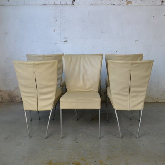 Sechs Spica-Stühle, entworfen von Gijs Papavoine und hergestellt von Montis. Diese Stühle aus dem Jahr 1991 vereinen Eleganz und Komfort und sind mit beigefarbenem und grauem Leder bezogen. Die Beine sind aus Metall. Ideal für ein modernes Esszimmer oder Büro.