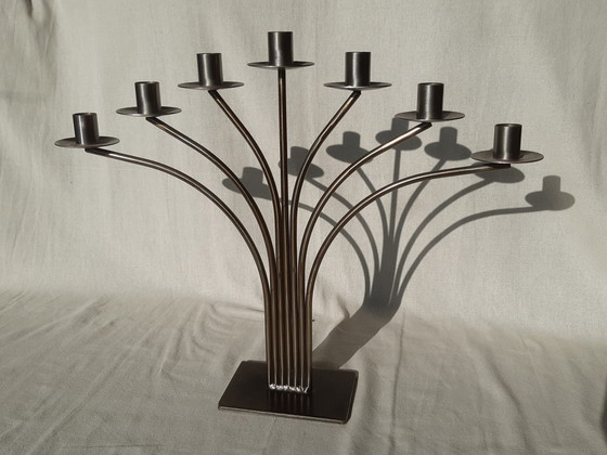 Sehr schöner 7-armiger Messingkandelaber. 41 cm hoch, 51 cm breit und eine Grundplatte von 15 x 10 cm. Guter Vintage-Zustand mit einigen Verfärbungen und Resten von rotem Kerzenwachs, wie auf den Detailfotos zu sehen.