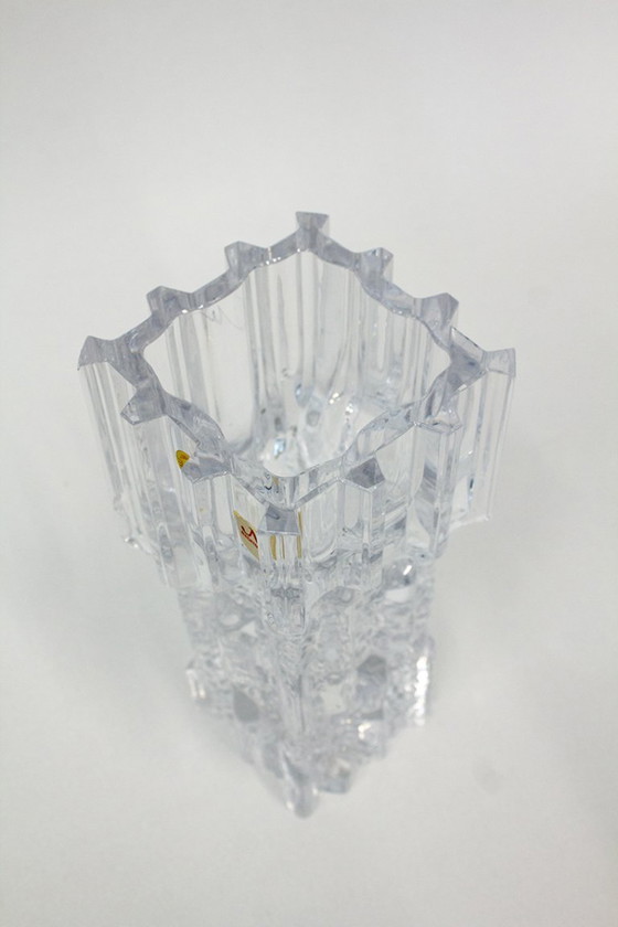 Was für ein schönes Stück deutscher Handwerkskunst ist diese Eisblockvase von Nachtmann Bavaria aus den 1970er Jahren! Die Vase verwebt brutalistische, harte Linien mit raffinierten, dynamischen, fragmentarischen Kristallstücken und schafft so ein zeitloses Design, das an einen Eisblock erinnert.