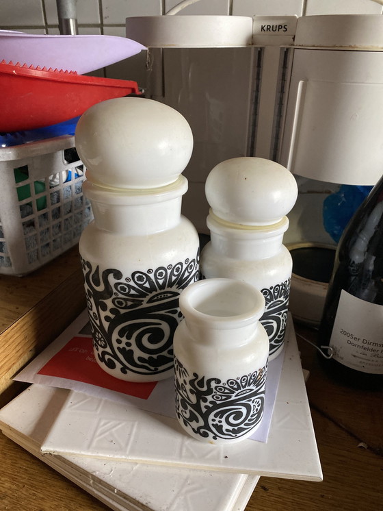 3 iconische original 70er Jahre Behälter Glas Made in Belgium Container made in Belgium Zwei mit Deckel, einer ohne Deckel Grösster höhe 23 - durchmesser 10 Mittlerer 18 durchmesser 8 Kleiner 10 und durchmesser 6