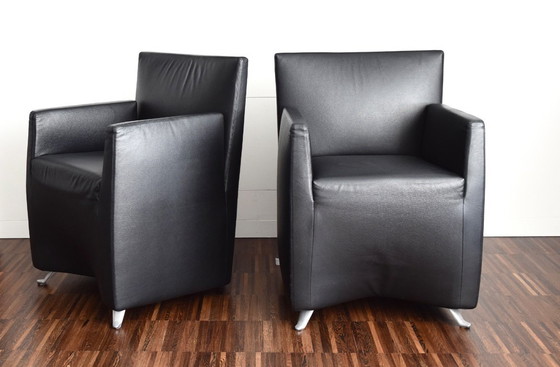 Sessel mit verstellbarer Rückenlehne, komplett mit schwarzem Leder bezogen.