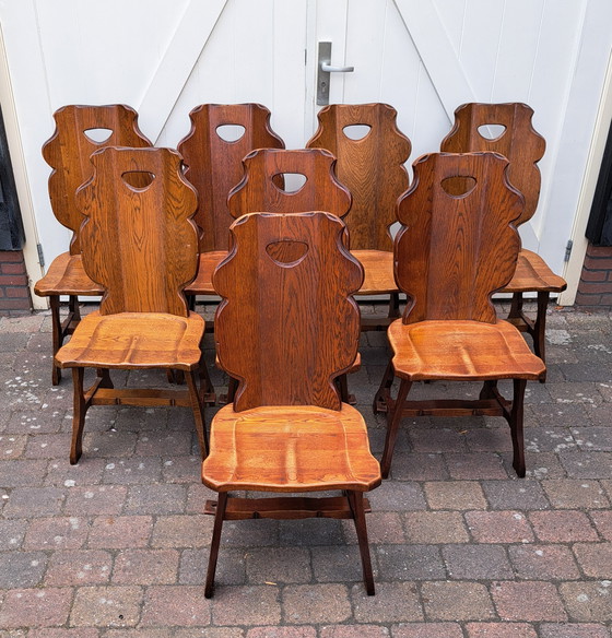 Entdecken Sie dieses Set aus acht wunderschönen brutalistischen Eichenstühlen, die eine echte Bereicherung für jede Einrichtung sind, die einen Hauch von robuster Eleganz sucht. Diese Stühle strahlen mit ihrem einzigartigen Design und ihrer robusten Konstruktion einen zeitlosen Charme aus, der sich sowohl für moderne als auch für klassische Umgebungen eignet. Die warmen Holztöne und die detaillierte Verarbeitung machen diese Stühle zu einem Blickfang in jedem Raum.