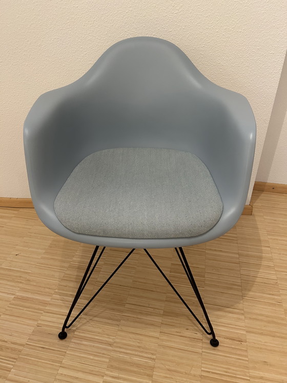 Eames Plastic Armchairs DAR. Die Stühle sind in nahezu neuwertigem Zustand (im Laden gebraucht) und verfügen über eine blau-graue Lackierung mit Stoffsitz und Metallgestell. Ein ikonisches Designstück für jedes Interieur.
