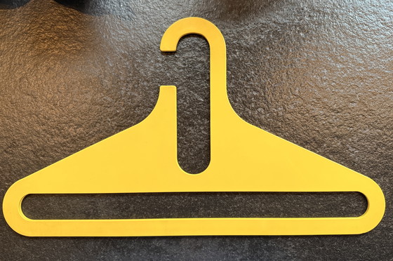Deze gele plastic kledinghangers zijn een bekend voorbeeld van Pop-art en Space Age-design uit die periode. Ze zijn gemaakt van stevig kunststof en staan bekend om hun heldere kleuren en afgeronde randen.