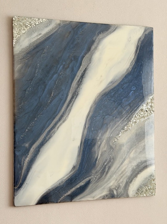Verschönern Sie Ihr Zuhause mit diesem exklusiven, einzigartigen Harzkunstwerk, das mit Sorgfalt und Präzision handgefertigt wurde. Das 80 × 66 cm große abstrakte Gemälde besticht durch seine satten Blau- und Weißtöne, die durch Spiegelglassplitter, welche das Licht reflektieren und einen atemberaubenden Schimmereffekt erzeugen, noch verstärkt werden.