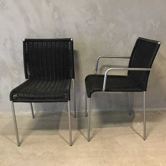 Accademia Pottoco Agra Esszimmerstuhl-Set (8-teilig) Geräumiges, leichtes Esszimmerstuhl-Set. Das Set besteht aus 6 Stühlen ohne Armlehnen und 2 Stühlen mit Armlehnen. Der Armlehnstuhl ist 54 cm breit. Die Stühle ohne Armlehnen sind 48 cm breit. Die Stühle sind stapelbar. Das Metall hat eine matte Chromoberfläche. Das extrem robuste Seil ist anthrazitfarben.