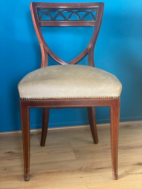 Tauchen Sie ein in die Eleganz des frühen 19. Jahrhunderts mit diesem exquisiten Set aus acht Mahagoni-Esszimmerstühlen aus der Empire-Zeit. Diese Stühle zeugen von klassischem Design. Sie zeichnen sich durch eine schildförmige, offene Rückenlehne mit halbrunden Verzierungen aus und ruhen elegant auf Säbelbeinen. Beine und Rückenlehne sind mit wunderschönen Messingintarsien verziert, die ihrem zeitlosen Charme einen Hauch von Raffinesse verleihen. Die mit luxuriösem beigefarbenem Velours gepolsterten Stühle bieten Komfort und Stil und sind die perfekte Ergänzung für jedes formelle Esszimmer.