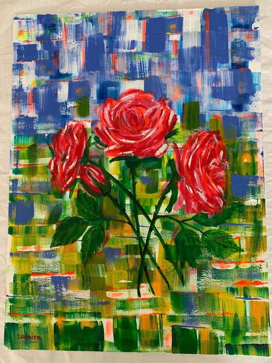 30 x 40 cm Künstlerin: Samira Sayyah Acryl auf Platte Handsigniert Auflage: Unikat Still: Surrealismus - ohne rahmen - Diese wunderschöne Acrylmalerei zeigt eine Gruppe leuchtender roter Rosen, die sich in ihrer vollen Pracht präsentieren. Die lebhaften Blumen stehen im Mittelpunkt des Kunstwerks und strahlen eine tiefe emotionale Wärme aus. Der Hintergrund ist abstrakt gestaltet, mit dynamischen blauen und grünen Farbtönen, die wie ein modernes Mosaik wirken und den Kontrast zu den roten Rosen verstärken. Die harmonische Kombination von intensiven Farben und Texturen vermittelt ein Gefühl von Lebendigkeit und Naturverbundenheit. Die Maltechnik spiegelt eine ausdrucksstarke Kreativität wider und zieht den Betrachter in die Schönheit und Symbolik der Rosen hinein – ein zeitloses Symbol für Liebe und Leidenschaft.