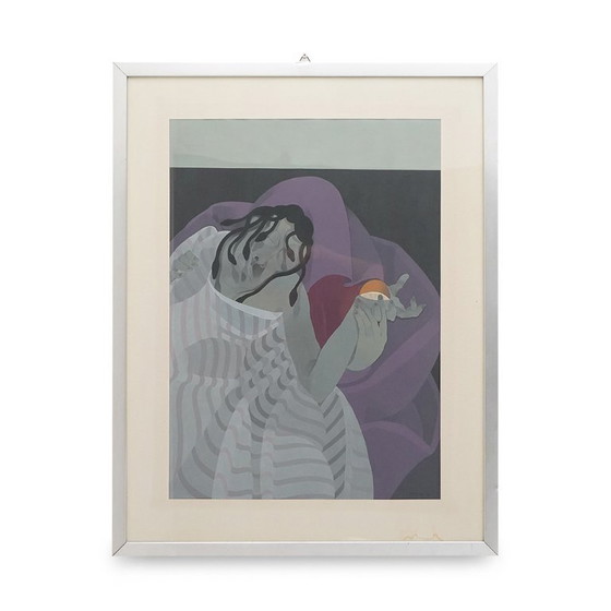Dieses suggestive und visionäre Werk von Daniel Bec aus dem Jahr 1973 zeigt eine liegende männliche Figur, die in gestreifte Laken gehüllt ist und zwischen Stille und einem mysteriösen Unbehagen schwebt.