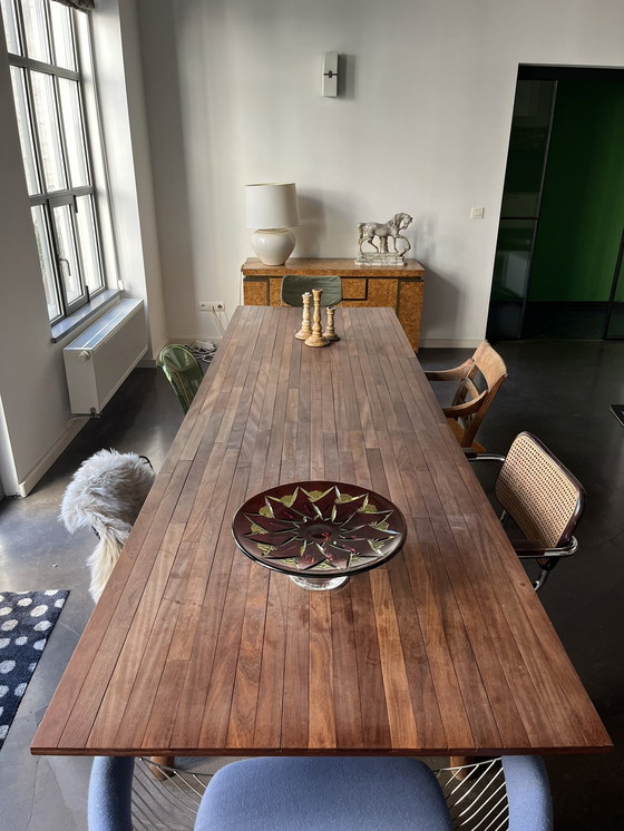 Esstisch für 12 Personen aus Afrormosia-Holz mit einer Platte aus Latten, die wie Parkett verlegt sind, hergestellt vom Genter Holzkünstler Philippe Allaeys vom Studio Alph'. Der Tisch hat eine angenehme Breite von 93 cm, so dass man auch an der kurzen Seite des Tisches angenehm sitzen kann.