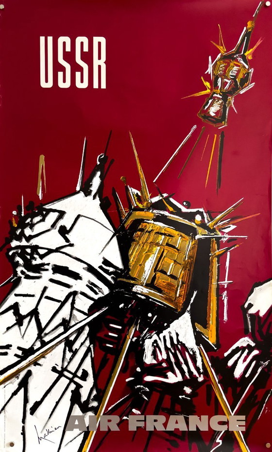 Ein sattes Purpurrot entfacht Georges Mathieus explosive kalligrafische Gesten: Zacken in Schwarz, Weiß und metallischem Ocker explodieren zu sternenartigen Formen, die an Kremlspitzen und Leuchtfeuer erinnern. Das kompakte „UdSSR“ krönt die Komposition, während eine markante, silberne Linie „AIR FRANCE“ das Bild verankert; Mathieus Signatur in der Druckplatte unten links bestätigt die Urheberschaft. Die malerische Oberfläche verzichtet auf die wörtliche Darstellung von Sehenswürdigkeiten und übersetzt Geschwindigkeit, Distanz und Modernität in eine reine Geste – ein Sinnbild für den Optimismus des Jet-Age, gefiltert durch französische lyrische Abstraktion.