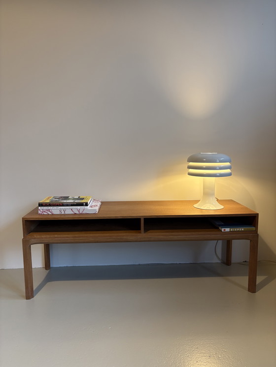 Es ist aus hochwertiger Eiche gefertigt und bekannt für seine klaren Linien und funktionalen offenen Fächer. Das Eichenholz ist in exzellentem Zustand und seltener als die Teakholzvariante. Ein erstklassiges dänisches Design und ein begehrtes Modell!