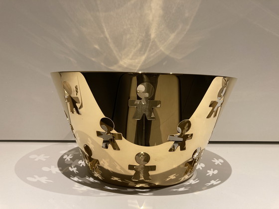 Dies ist eine limitierte Auflage der Alessi Girotondo Schale, entworfen von King Kong. Sie ist aus rostfreiem Stahl gefertigt und von Hand mit 24 Karat Gold vergoldet. Dies ist die Nummer 857 von 1.000, was sie zu einem seltenen Sammlerstück macht. Die Schale ist in perfektem Zustand und wird mit der Originalschachtel und einem Echtheitszertifikat geliefert. Das einzigartige Design mit seinen verspielten, geschnitzten Figuren verleiht jedem Ambiente einen Hauch von Eleganz und Laune. Ideal für Sammler oder als luxuriöses Dekorationsstück.
