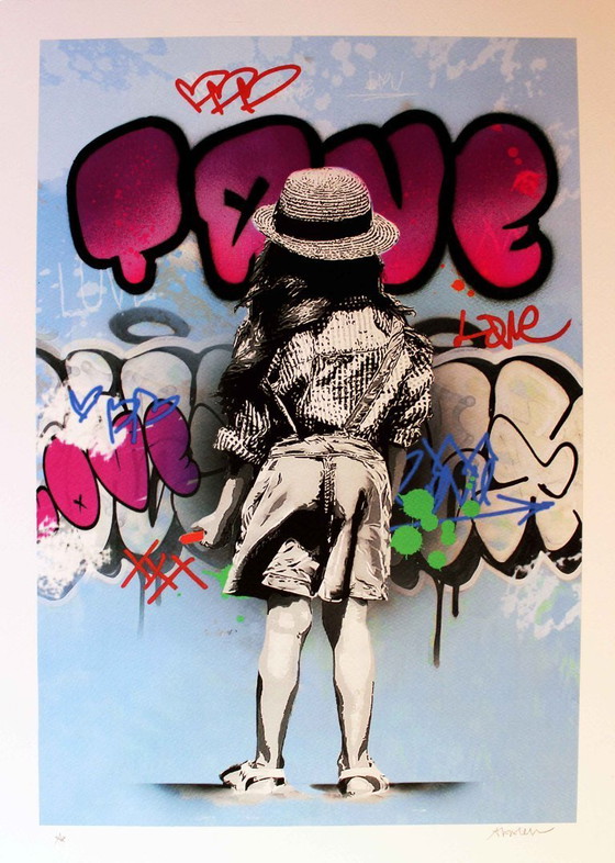 Künstlerexemplar (AP), ein einzigartiges, unnummeriertes Kunstwerk direkt aus dem Atelier von Alessio B, einem italienischen Künstler, der für seine Werke bekannt ist, die visuelle Poesie und urbane Sprache vereinen. Seine Arbeiten, oft inspiriert von menschlichen Emotionen und Symbolen der Unschuld, interpretieren Street Art mit einer sensiblen und raffinierten Herangehensweise neu.