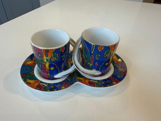 Zum Verkauf steht ein neuwertiges „So French“ Decor du Galion Tête à Tête Kaffee-/Teeservice mit zwei kleinen Tassen und einer Untertasse. Das Service ist in perfektem Zustand, die Goldränder sind intakt und es gibt keine Abplatzungen. Tablett: 18 x 10,5 cm, Tassen: 6,5 x 5,5 cm