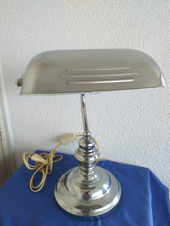 Vintage IKEA Banker's Lampe aus den 1980er Jahren. Ausgeführt in verchromtem Metall und schwenkbarem Lampenschirm, sowie Schnurschalter.