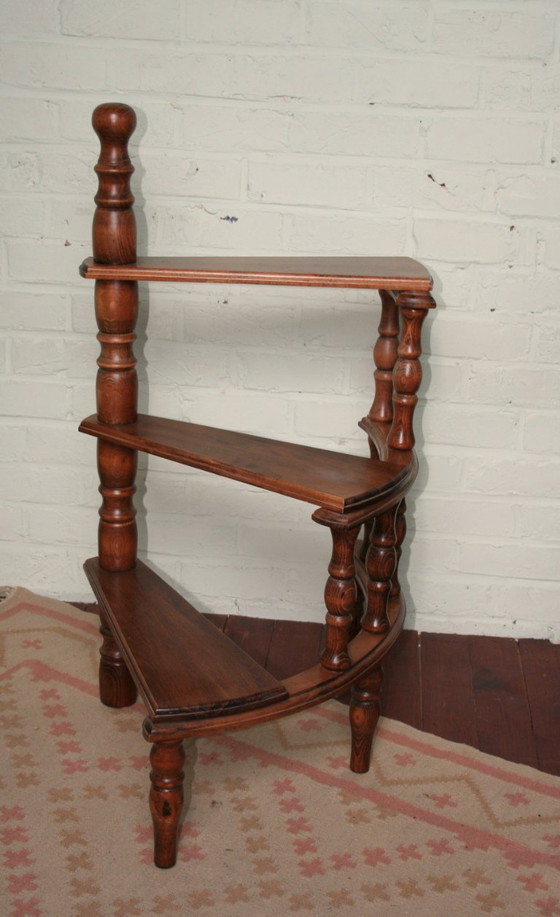 Vintage Bibliothek Treppe in perfektem Zustand. Besteht aus einem sehr stabilen Rahmen mit drei Stufen, die jeweils 24 cm hoch sind und sich in einem Winkel von 90 Grad zueinander erstrecken. Dieses Stück stammt aus einer Hausbibliothek. Wunderschön gedrechselte Holzarbeiten. Perfekter Zustand.
