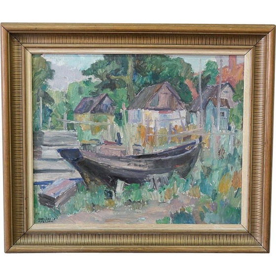 Das expressionistische Ölgemälde von 1949. Es wurde von dem klassifizierten schwedischen Maler Karl Enock Ohlsson geschaffen, der zwischen 1889 und 1958 lebte. Das Gemälde ist in der linken unteren Ecke handsigniert und datiert. Das Gemälde ist in Öl auf Leinwand gemalt. In seinem ursprünglichen Rahmen. Das Gemälde kann per Post verschickt werden, z.B. Fed-ex, DPD usw. Karl Enock Waldemar Ohlsson (15. Mai 1889 - 20. März 1958) war ein schwedischer Maler und Zeichner. Ohlsson studierte an der technischen Schule in Malmö und unternahm 1904-1908 mehrere Studienreisen nach Hamburg, England, Frankreich und Kairo. Er debütierte 1915 in einer Sammlungsausstellung und stellte 1917 zum ersten Mal separat aus. Er war Mitglied der Künstlergruppe Aura und nahm ab 1928 an den Ausstellungen dieser Gruppe teil. Seit 1915 nahm er fast jährlich an den Ausstellungen des skånes konstförenings in Malmö teil und beteiligte sich auch an Sammlerausstellungen in Kopenhagen, Stockholm und Göteborg. Seine Kunst besteht aus Stillleben, Porträts, figurativen Motiven und Landschaften, oft von Stadträndern mit Fabriken und Hafenansichten. Im Jahr 1939 veröffentlichte er das Buch Karl Enock Ohlsson. Ohlsson ist im Malmö Museum, im Helsingborg Museum, im Tomelilla Museum und im Landskrona Museum vertreten.