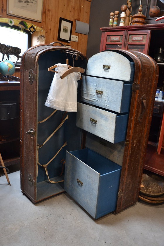 Dieser wunderschöne, antike Reisekoffer ist ein echter Glücksgriff für Vintage- und Antiquitätenliebhaber. Mit seiner reichen Geschichte und seinem einzigartigen Design verleiht er jedem Interieur einen Hauch von Nostalgie. Stellen Sie sich vor, wie dieser Koffer einst die Welt bereiste, gefüllt mit den persönlichen Gegenständen seines Besitzers, und nun als stilvolles Dekorationsobjekt in Ihrem Zuhause ein neues Leben erhält. Der Koffer verfügt über mehrere Schubladen und eine Kleiderstange, ideal zur Aufbewahrung von Kleidung und Accessoires. Das robuste Holz-Metall-Außenmaterial verleiht ihm ein wertiges Aussehen. Der Innenraum ist mit einem charmanten blauen Stoff ausgekleidet, der einen schönen Kontrast zum dunklen Äußeren bildet. Dieser Koffer ist nicht nur funktional, sondern auch ein echter Hingucker und wird Ihre Gäste begeistern. Bereichern Sie Ihre Sammlung mit diesem antiken Reisekoffer und verleihen Sie Ihrem Zuhause ein einzigartiges und historisches Flair.
