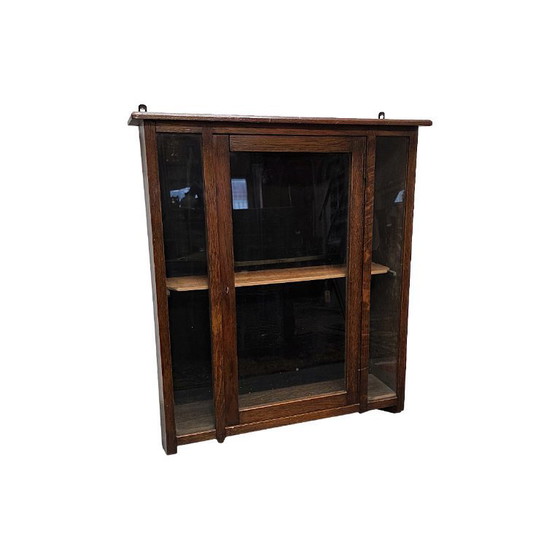Alter, wandmontierter Eichenschrank aus der Mitte des 20. Jahrhunderts. Dieser attraktive Schrank ist aus massiver Eiche gefertigt und verfügt über eine große Glastür mit beidseitiger Glasscheibe. Er hat einen mittigen Einlegeboden, der in der Vergangenheit ersetzt wurde, und das Schloss fehlt.