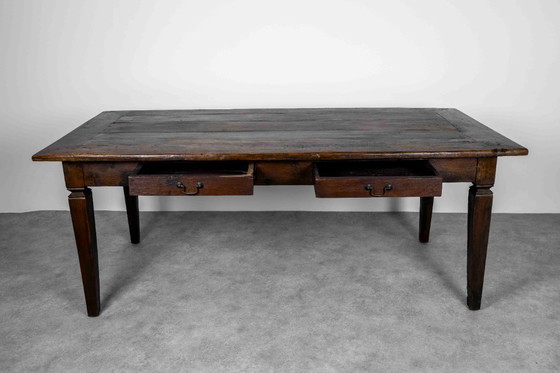Alter französischer Bauern- oder Klostertisch aus Eiche mit schöner Patina, verwitterten Kanten und zwei Schubladen unter der Tischplatte. Neoklassizistischer Stil mit konischen Beinen.