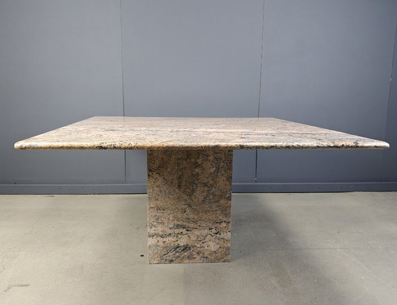 Großer quadratischer Granit-Esstisch mit schönem Natursteinmuster und zentralem Rücksprung.