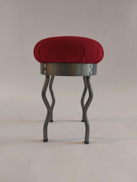 Ikea Hocker Uri aus dem Jahr 1995. Design von Per Ivar Ledang Postmodern/ Memphis-Stil Maße, Höhe 51 cm, Breite 35 cm Stoff, 55% Polyester und 47% Baumwolle Sockel und Beine aus lackiertem Metall