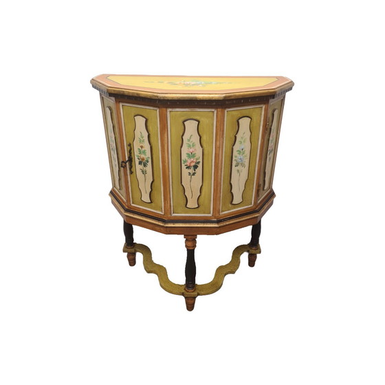 Italienischer bemalter Vintage-Schrank Firenze, aus den 1950er Jahren Schöner handbemalter italienischer Holzschrank mit Blumendekor. Er hat 1 Tür und steht auf einem Sockel mit 3 Beinen und ist komplett mit Schlüssel. Auf der Rückseite gestempelt mit G.V. Firenze.