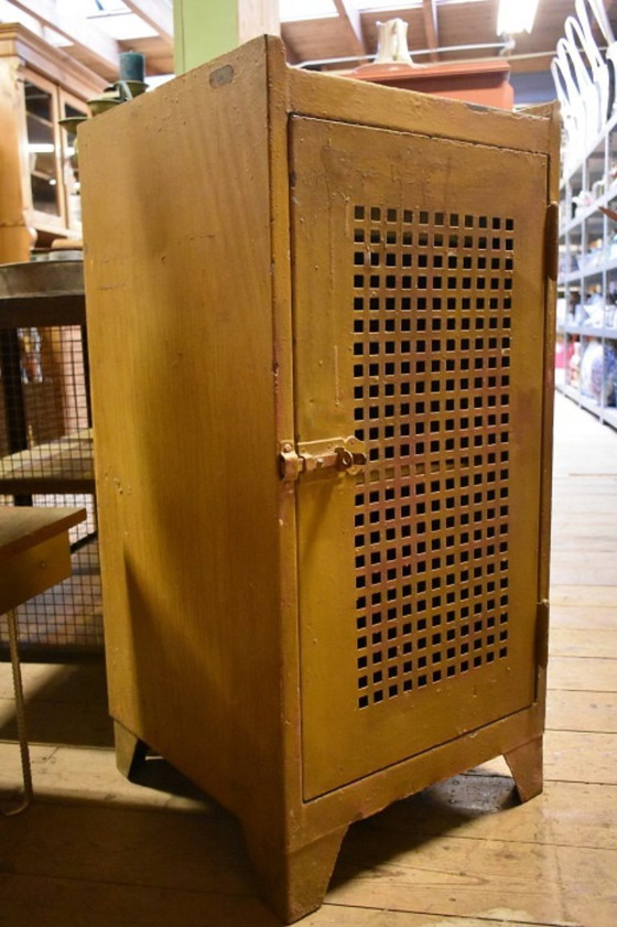 Dieser wunderschöne Vintage-Metallschrank ist ein echter Hingucker für Liebhaber des Industriestils. Seine markante Patina, kombiniert mit der ockergelben/dunkelgelben Lackierung, verleiht ihm einen authentischen und robusten Look. Die offene Tür mit quadratischem Muster unterstreicht den rustikalen Charakter.