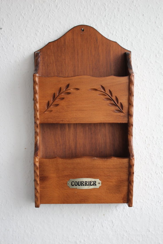 Dieses charmante französische Briefregal aus Holz besticht durch seine dekorativen Schnitzereien und bietet mit zwei Ablagen praktischen Stauraum für Ihre Post. Die warme Holzfarbe und die feinen Details verleihen jedem Raum einen Hauch von Eleganz.