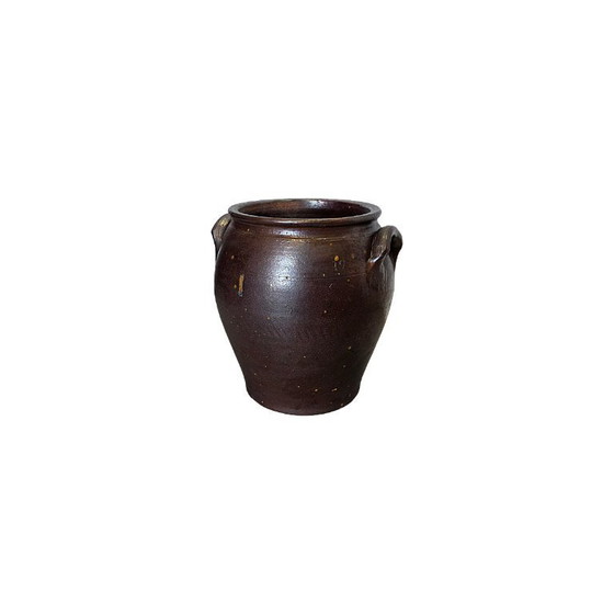 Altes französisches Brocante-Vorratsgefäß aus Steingut, aus der ersten Hälfte des 20. Jahrhunderts. Wunderschönes und dekoratives französisches Steingutgefäß mit Brocante-Charme. Es hat eine dunkelbraune Glasur mit dunkelviolettem Schimmer. Es ist mit der Nummer 12 versehen und hat zwei Henkel an beiden Seiten. In gutem Zustand ohne Risse oder Abplatzungen.