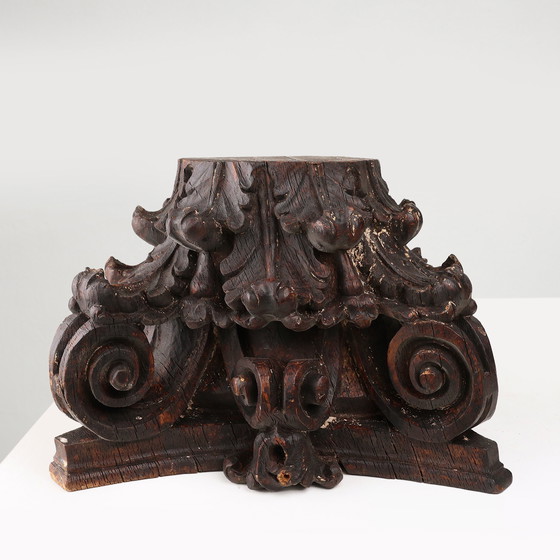 Handgefertigtes architektonisches Ornament aus Eiche aus dem 18. Jahrhundert, Frankreich. Das Design dieser korinthischen Säule ist eine klassische Darstellung der korinthischen Ordnung, mit kunstvollen Voluten (spiralförmigen Schnecken), Akanthusblättern und zarten floralen Motiven. Aufgrund seines Alters weist dieses Ornament eine schöne Patina auf, die ein reiches kulturelles Erbe und künstlerische Handwerkskunst widerspiegelt.