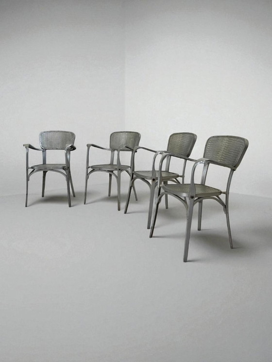 4er-Set Viort-Stühle – Salon de Provence – Aluminium – 85 x 48 x 58 cm. Ein originales Set aus 4 Viort-Aluminiumstühlen, bezogen aus Salon de Provence, Frankreich. Ihr industrielles und robustes Design macht sie perfekt für Möbel im Vintage-Stil, Lofts, Gewerberäume oder überdachte Außenbereiche. Abmessungen: Höhe 85 cm, Breite 48 cm, Tiefe 58 cm. Die Stühle sind langlebig und optisch ansprechend, mit einer strukturierten Oberfläche, die ihren ursprünglichen Charakter unterstreicht. Bitte sehen Sie sich die Fotos sorgfältig an, da sie einige altersbedingte Gebrauchsspuren aufweisen.
