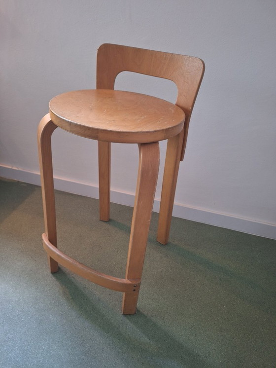 Sehr attraktiver und zeitloser Barhocker Artek K65. Ein Designklassiker, der in fast jedes Interieur passt. Der Hocker trägt die Patina der Zeit und stammt höchstwahrscheinlich aus den 1960er Jahren. Auf den Fotos sind die Gebrauchsspuren zu sehen. Die Vintage-Version dieses Hockers ist besonders begehrt.