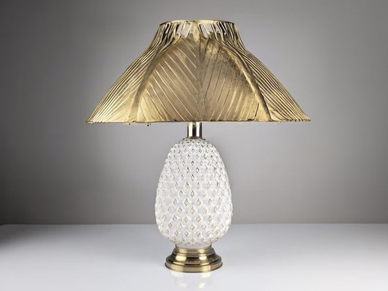 Schöne übergroße Tischlampe in Form einer Ananas. Ein atemberaubendes Mid Century Modern Stück, das in den 1970er Jahren in Italien hergestellt wurde. Der Korpus ist aus weißem Muranoglas mit einem geometrischen Reliefmuster gefertigt, das die raffinierte Textur der Lampe unterstreicht und mit goldenen Details verziert ist. Der Sockel und der Hals der Leuchte sind aus Messing gefertigt. Diese Komposition aus Glas und Messing macht sie zu einem idealen Stück für Innenräume, die nach einem eleganten und exklusiven Dekorationselement im Vintage-Stil suchen. Ihr zeitloses Design und ihr unverwechselbarer Stil machen sie zur perfekten Ergänzung für jeden Raum. Die abgebildeten Schirme sind Teil des Fotosets und gehören nicht zum Lieferumfang der Lampe. Gesamtabmessungen ohne Schirm: 50 cm x 25 cm