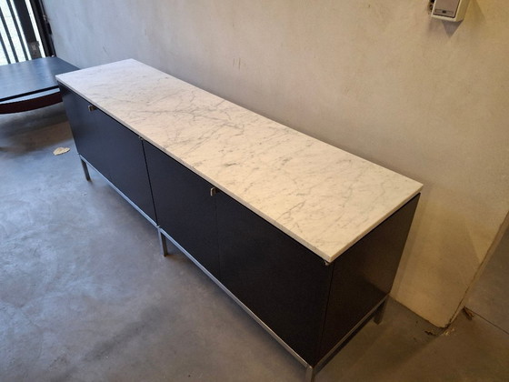 Hergestellt von Knoll International USA. Das Sideboard steht auf einem verchromten Stahlsockel und ist mit schwarzem Furnier versehen. Die Marmorplatte und die weiße Innenausstattung bilden einen schönen Kontrast. Die Anrichte hat vier Türen, Glaseinlegeböden und zwei Schubladen mit Fächern. Es weist leichte Verfärbungen durch Sonnenlicht auf und hat ein paar Gebrauchsspuren, wie auf den Fotos zu sehen ist.