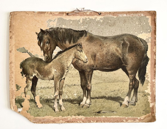 Schulkarte, doppelseitige Lithographie auf Karton, zeigt auf der einen Seite eine Stute mit ihrem Fohlen, auf der anderen Seite eine Kuh mit ihrem Kalb. Hergestellt um die Wende des 19. Jahrhunderts von dem bekannten dänischen Lithographen Alfred Jacobsen. Auf beiden Seiten mit seinem Logo gestempelt. Breite 32,5 cm Länge 42 cm