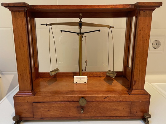 Sehr gut erhaltene Apotheken- oder Laborwaage aus der renommierten Rotterdamer Fabrik Becker's Sons aus dem frühen 20. Jahrhundert. Rekalibriert 1965 von der Amsterdamer Firma A. L. Boss. Wägebereich bis zu 50 Gramm. Die Waage hat ein Lot zur horizontalen Einstellung und verstellbare Füße. An der Vorderseite eine Glasschiebetür mit einer Elfenbeinplatte mit dem Namen des Herstellers dahinter. Ebenfalls auf der Vorderseite eine hölzerne Schublade mit den folgenden Teilen: 4 Messingwaagen zum Wiegen; 2 Hornwaagen; 1 Metallablage für Gewichte, ebenfalls von der Firma Becker. Die Gewichte fehlen.