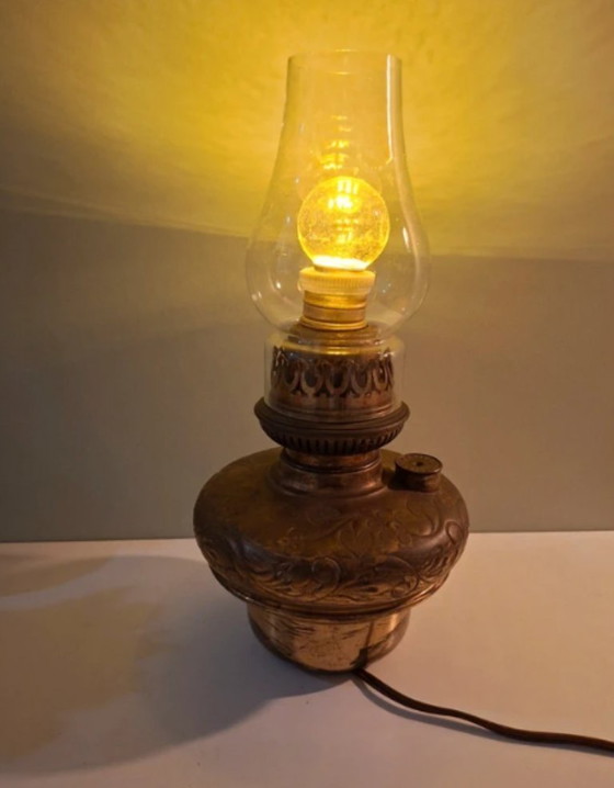 Ursprünglich eine Petroleumlampe, wurde sie später fachmännisch auf elektrisches Licht umgerüstet. Dieses einzigartige Stück vereint historischen Charme mit praktischer Funktionalität.