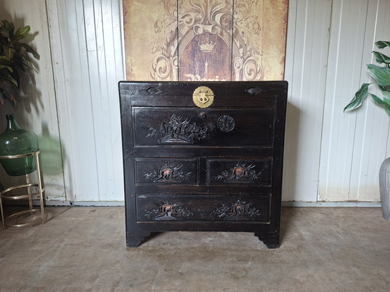 Entdecken Sie die zeitlose Eleganz dieser antiken chinesischen Kommode – ein Meisterwerk handwerklicher Kunst und Raffinesse. Mit ihrem kunstvollen Chinoiserie-Design verleiht sie Ihrem Zuhause einen Hauch orientalischer Mystik. Die Kommode verfügt über zwei Klappen und drei geräumige Schubladen, ideal zur Aufbewahrung Ihrer Wertgegenstände.