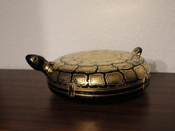 Sehr seltene, große antike Lackdose in Form einer Burma Schildkröte, mittig auf der Schildkröte typische Jugendstilornamente. Altersbedingt sind Gebrauchsspuren, insbesondere am Hals, vorhanden, Kopf und Hals der Schildkröte wurden mit Klarlack konserviert, um ein weiteres Abplatzen der Lackschichten zu verhindern.