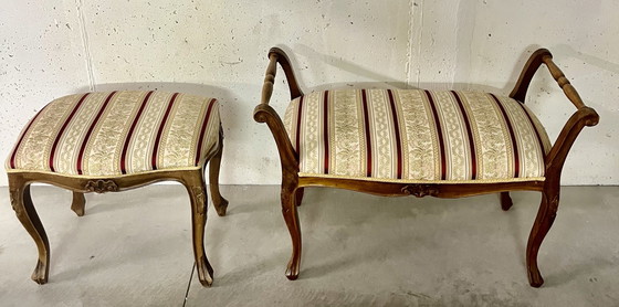 Antike, gepolsterte Holzbank und Hocker im Stil Louis XV aus der Mitte des 19. Jahrhunderts. Der Stil zeichnet sich durch geschwungene, natürliche Linien aus, darunter geschwungene Armlehnen und Cabriole-Beine (S-förmig), sowie die für Louis XV typischen, dezenten floralen Schnitzereien an der Zarge. Das Set gehörte zur Einrichtung einer Suite in einem alten venezianischen Gasthaus. Es wurde unter Beibehaltung des Originalbezugs restauriert. Der Nussbaumrahmen ist mit vergoldeten floralen Verzierungen auf hellem Grund und hochwertiger Goldborte verziert. Dieses Möbelstück vereint klassische Eleganz mit funktionalem Design. Es befindet sich in exzellentem Zustand. Maße der Bank: 82 x 55 x 42 cm. Maße des Hockers: 50 x 45 x 40 cm. Die Versandkosten werden separat berechnet.