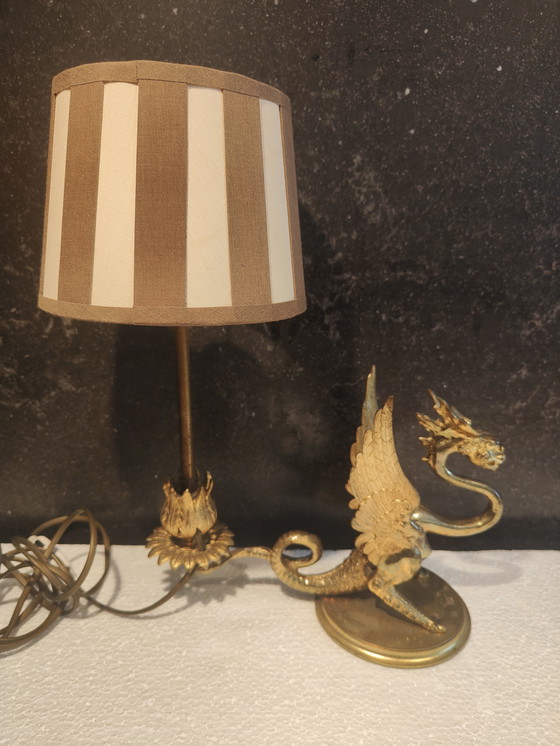 Wunderschöne antike Tischlampe mit detailreichem, mythologischem Drachenmotiv. Die aus bronzefarbenem Metall gefertigte Lampe besticht durch ihren einzigartigen, geflügelten Drachenfuß. Ein echter Blickfang für Liebhaber von Antiquitäten und Fantasy. Die Lampe ist in gutem Zustand, voll funktionsfähig und verleiht jedem Interieur einen Hauch von Mystik.