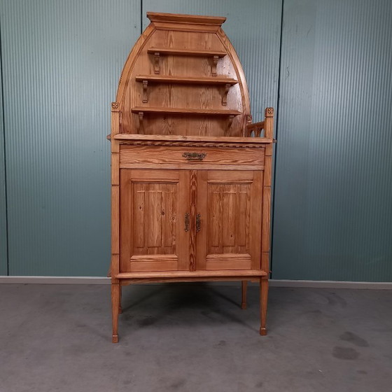 Dieser außergewöhnliche Kiefernschrank im Stil der Amsterdamer Schule ist ein wahres Prunkstück und ein Blickfang für jedes Interieur. Ob im Wohnzimmer, Geschäft, Büro, in der Pension oder im Empfangsbereich – dieses charaktervolle Möbelstück fügt sich mühelos in jede Umgebung ein und zieht stets die Blicke auf sich. Eines ist sicher: Es gibt kein zweites Exemplar.